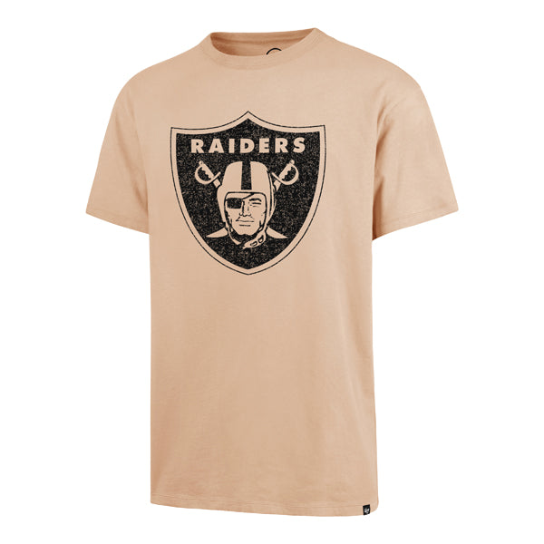 Show off your Las Vegas Raiders pride in style with this khaki-colored men's t-shirt from 47' Brand. Made from 100% cotton, the Las Vegas Raiders Men's Dusted Imprint River T-Shirt short-sleeve tee is designed for ultimate comfort, offering a super soft and lightweight feel that you'll love wearing all day long. The front of the shirt features a large distressed team logo, giving it a vintage look that adds character to your game-day outfit. The back is kept blank, providing a clean and simple design. Grab yours today and represent your team in comfort and style!