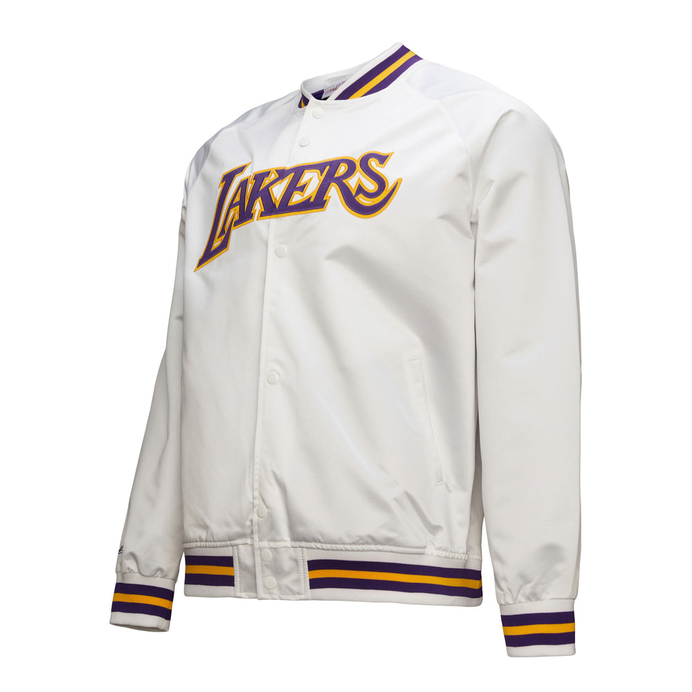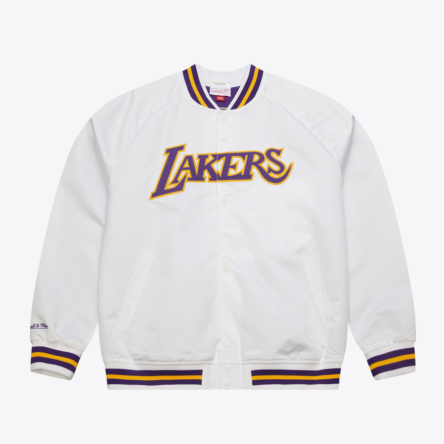Rep your Los Angeles Lakers in classic style with this Hardwood Classics Throwback Wordmark Raglan Satin Full-Snap Jacket from Mitchell & Ness. It features embroidered appliques of a retro team wordmark across the chest, bringing old-school charm to your modern-day fandom. Satin fabric creates a lustrous look, while rib-knit striping adds a sporty touch to this Los Angeles Lakers jacket.