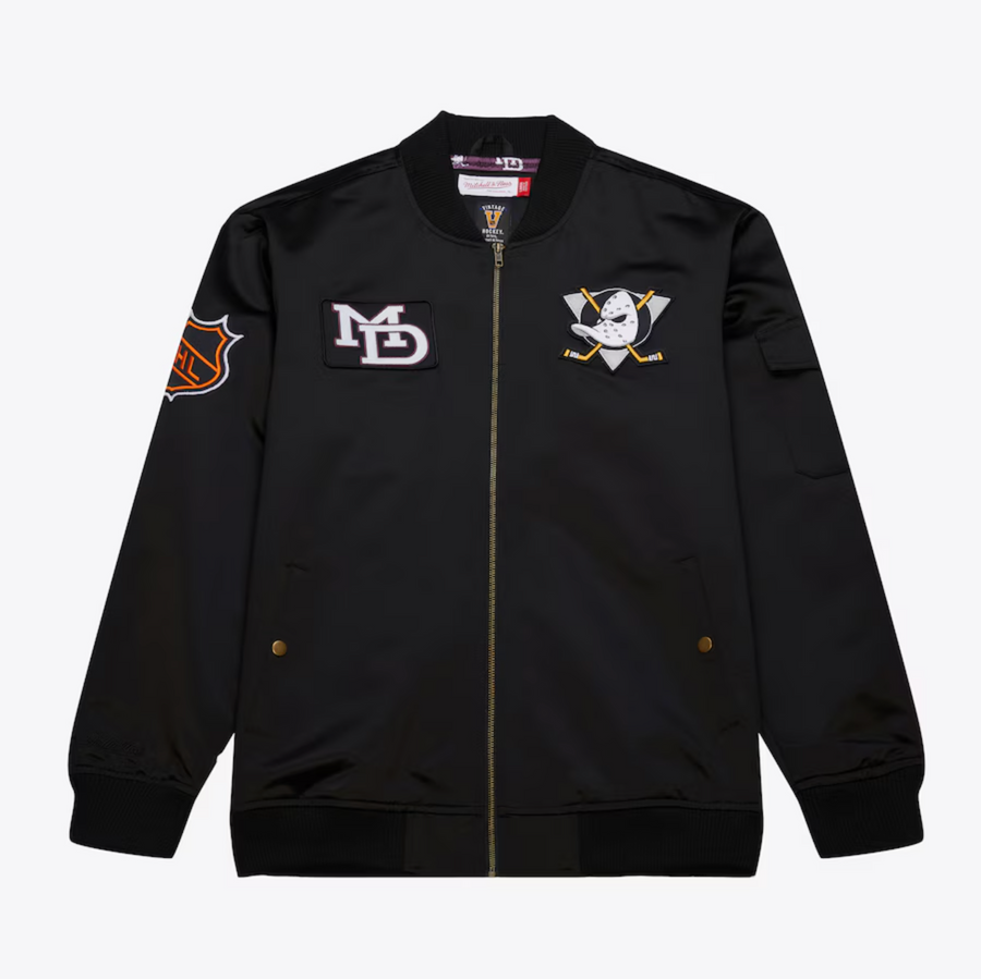 Show off your Anaheim Ducks pride with this stylish Satin Bomber Vintage Full-Zip Jacket. It's perfect for moderate temperatures, while the ribbed collar, cuffs, and hem help keep the elements out. The throwback-inspired embroidered patches and team logos with print lining make this jacket game-day-ready, from tailgating to grabbing the victory at the end of the game.